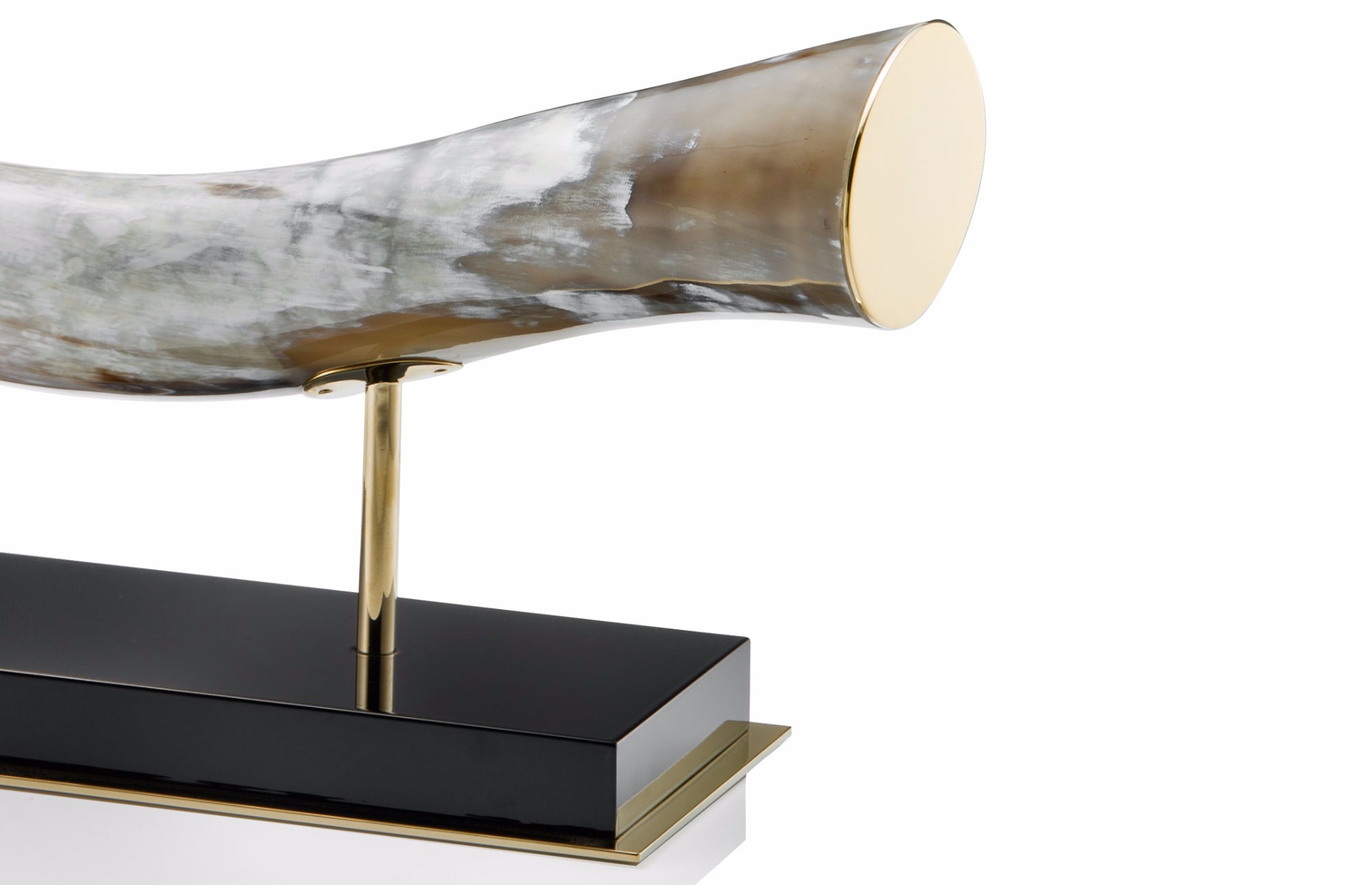 Horn sculpture base in wood with lacquered black gloss finish and 24K gold plated brass. Structure and end plate in hand engraved 24K gold plated brass.